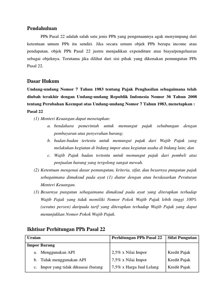 Untuk memudahkan pemahaman mengenai ketentuan dan perhitungan pph pasal 26 tersebut, berikut ini adalah contoh yang mengilustrasikan penghitungan pajak yang bisa anda pelajari. 2.5% x nilai impor, bagi importir yang menggunakan angka pengenal impor (api). Sebuah perusahaan melakukan penyerahan barang kena pajak. Pt 11 akuntansi memiliki nomor api, malakukan impor komputer dari amerika serikat dengan perincian sebagai berikut Pph pasal 22 yang dipungut oleh bendaharawan.